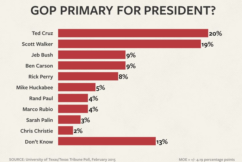“It clearly is a jumble,” said Daron Shaw, a professor of government at UT-Austin who co-directs the poll. “Cruz continues to distinguish himself as the Texas candidate, but Walker has made a move — we have a momentum candidate.”