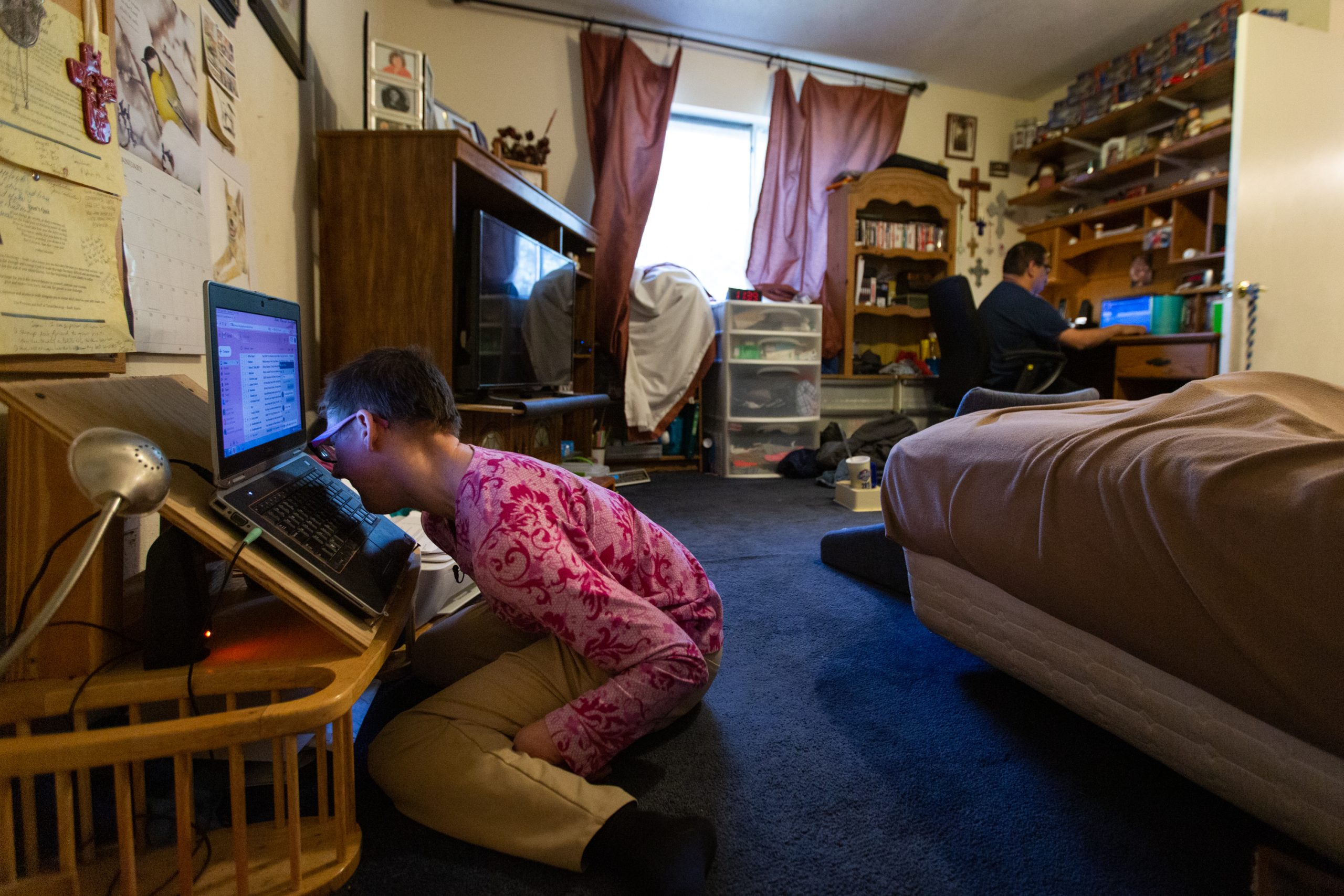 Angel gets out of her wheelchair and sits on the floor at her workstation. A blue glow from her laptop washes over her face as she types out a message, slowly and deliberately, using her nose to press buttons on the keyboard.