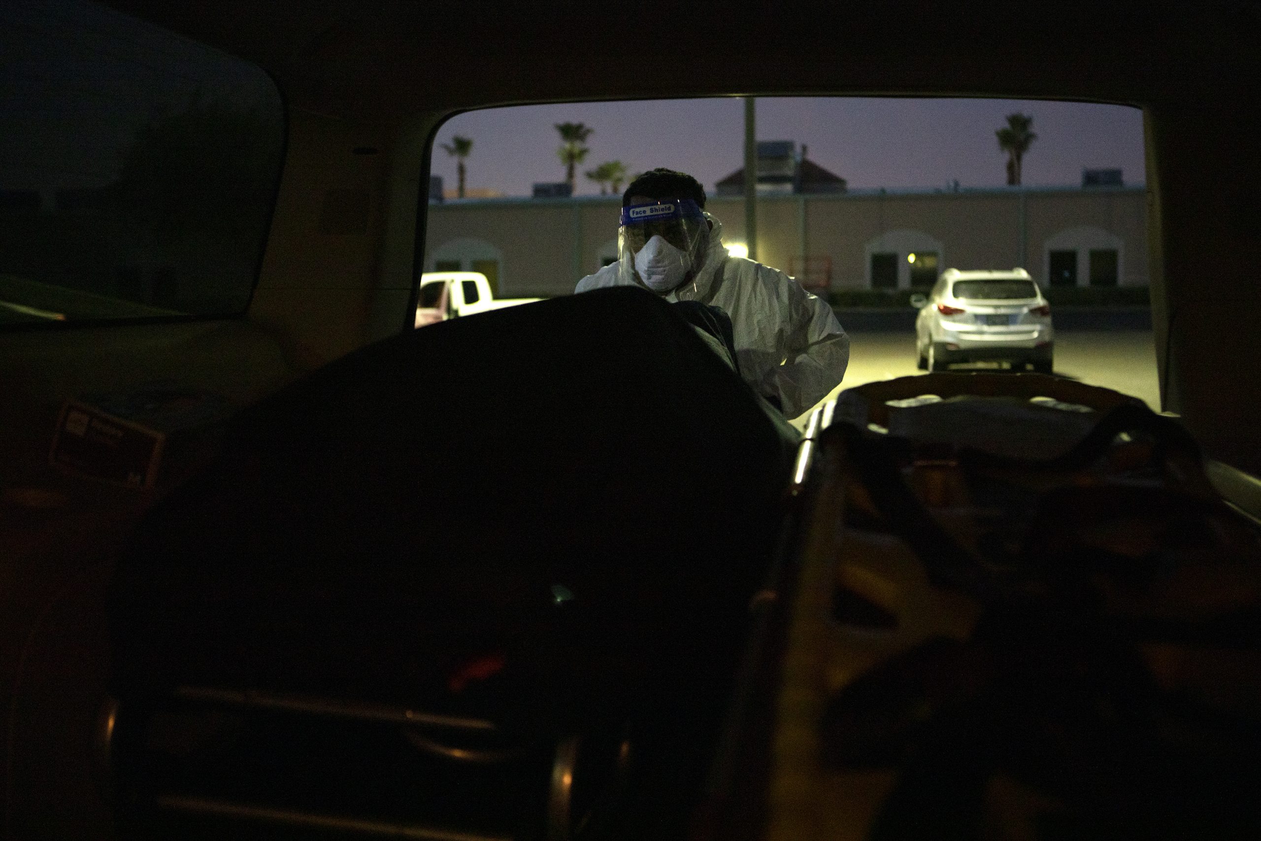 These are the first jobs of the day — and far from the last. Lopez will pick up 16 bodies Saturday, wake up at 2 a.m. Sunday and transport 22 more, including a husband and wife both infected with the virus.