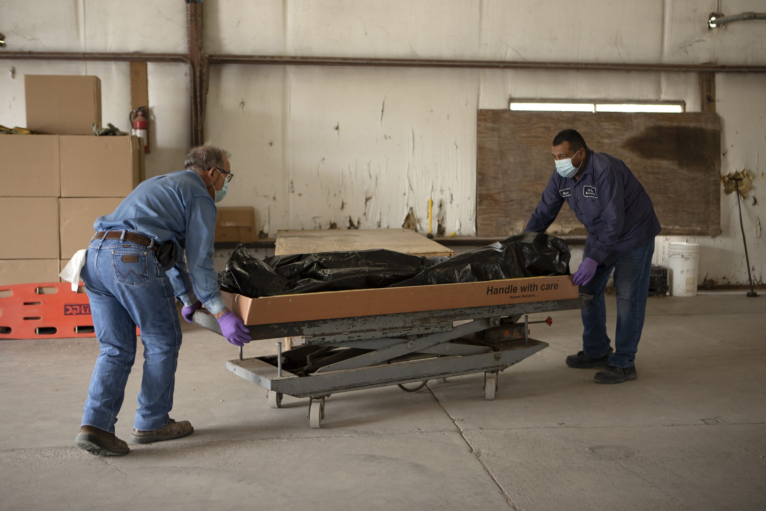 Al Luna and Miguel Guzman move a body that was recently dropped off at a crematorium in Donna and place it in an incinerator. The crematorium has seen more bodies due to the outbreak of COVID-19 in the Rio Grande Valley. Credit: Miguel Gutierrez Jr./The Texas Tribune