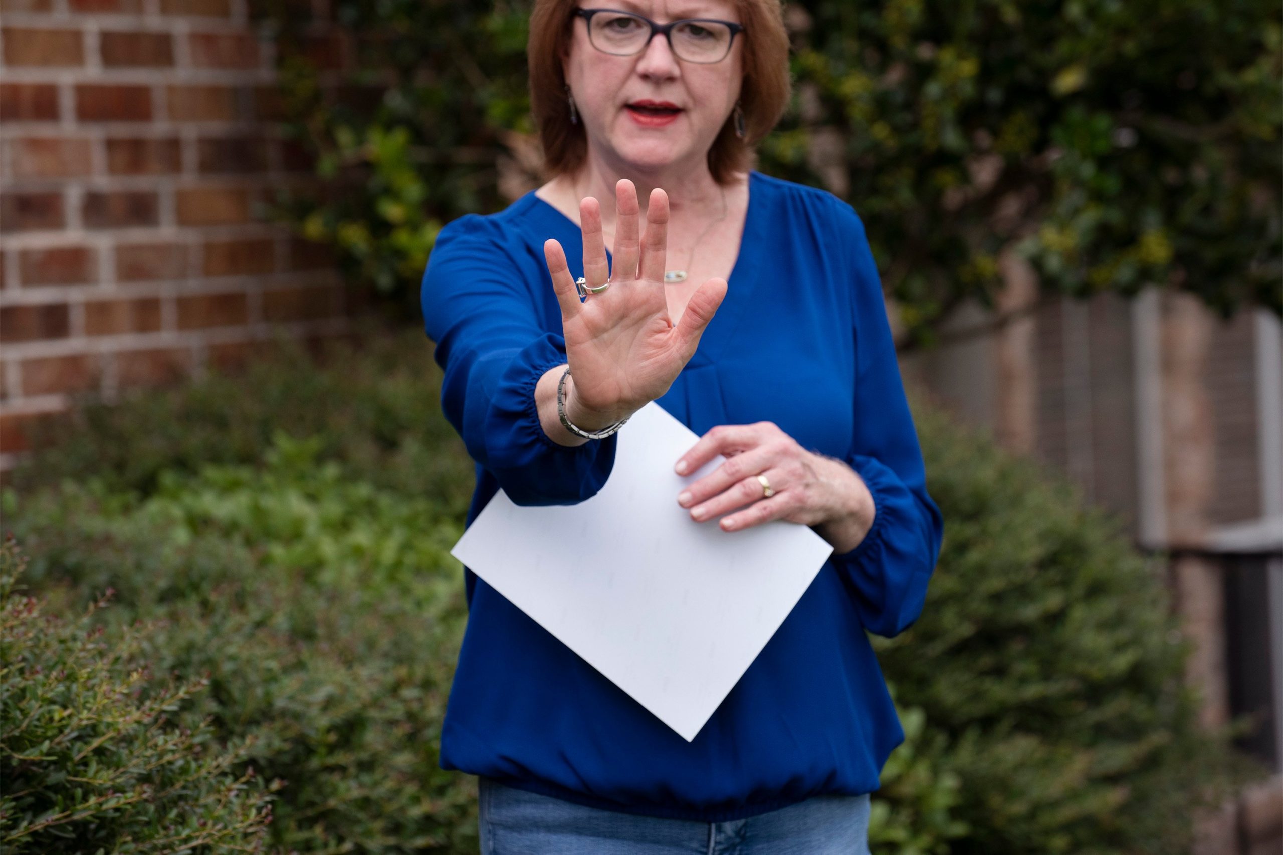 FIrst: Genny Lutzel holds a photograph of her mother. Center: Lutzel shows how she touches the window when she visits her mother. Last: She is afraid she won’t hug her mom until “someone declares her to be actively dying,” she said in an interview. Credit: Ben Torres for The Texas Tribune