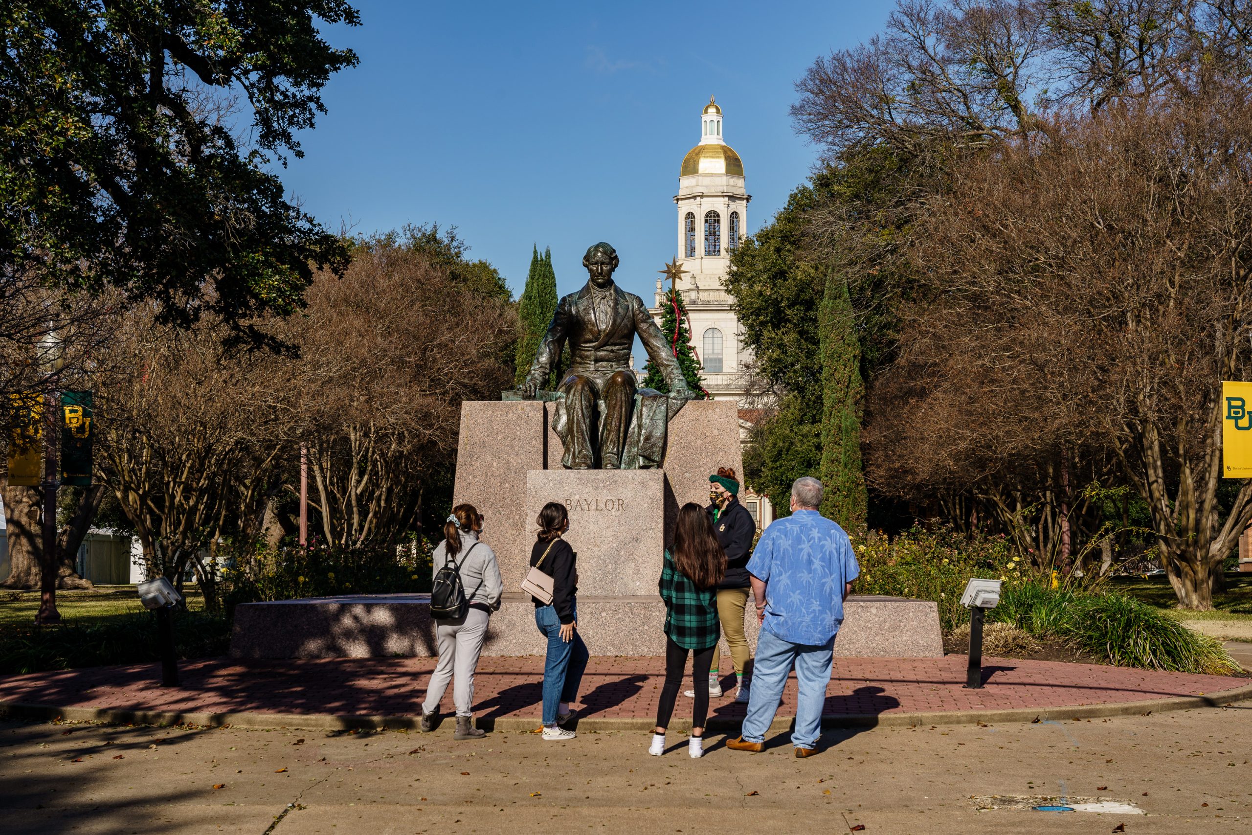 First: Lexy Bogney, a senior at Baylor University, serves as secretary and community coordination chair for the Baylor NAACP and is a member of the Commission on Historic Campus Representations. Last: Prospective students on a campus tour pass in front of the statue of Judge Baylor at Baylor University in Waco. Credit: Briana Vargas and Jordan Vonderhaar for The Texas Tribune