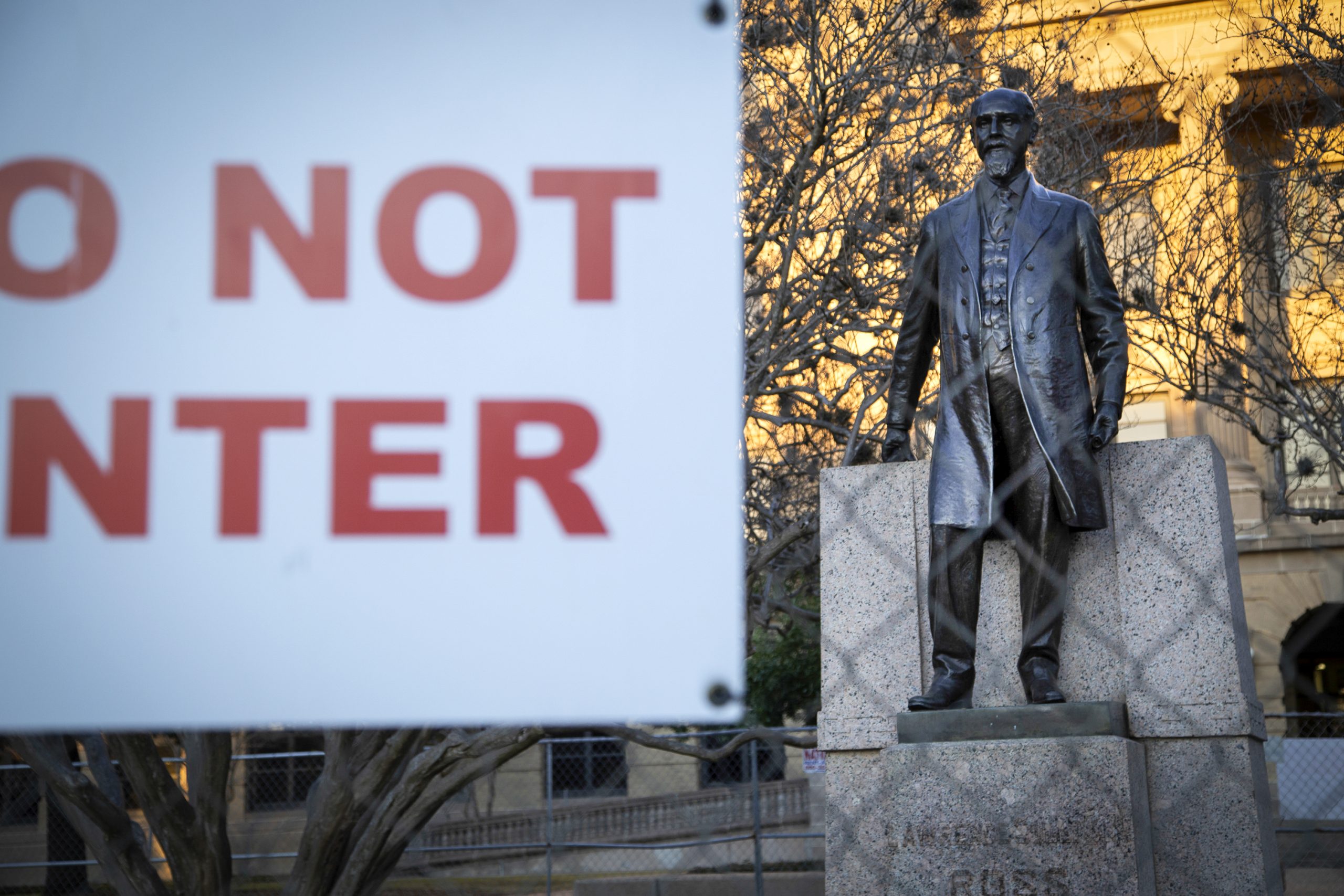 First: The statue of former Texas A&M President Lawrence Sullivan “Sul” Ross is fenced off from the rest of campus. The university put up the fence after calls to remove it. Last: Qynetta Caston, a student at Texas A&M, stands in front of the statue. Credit: Evan L’Roy/The Texas Tribune