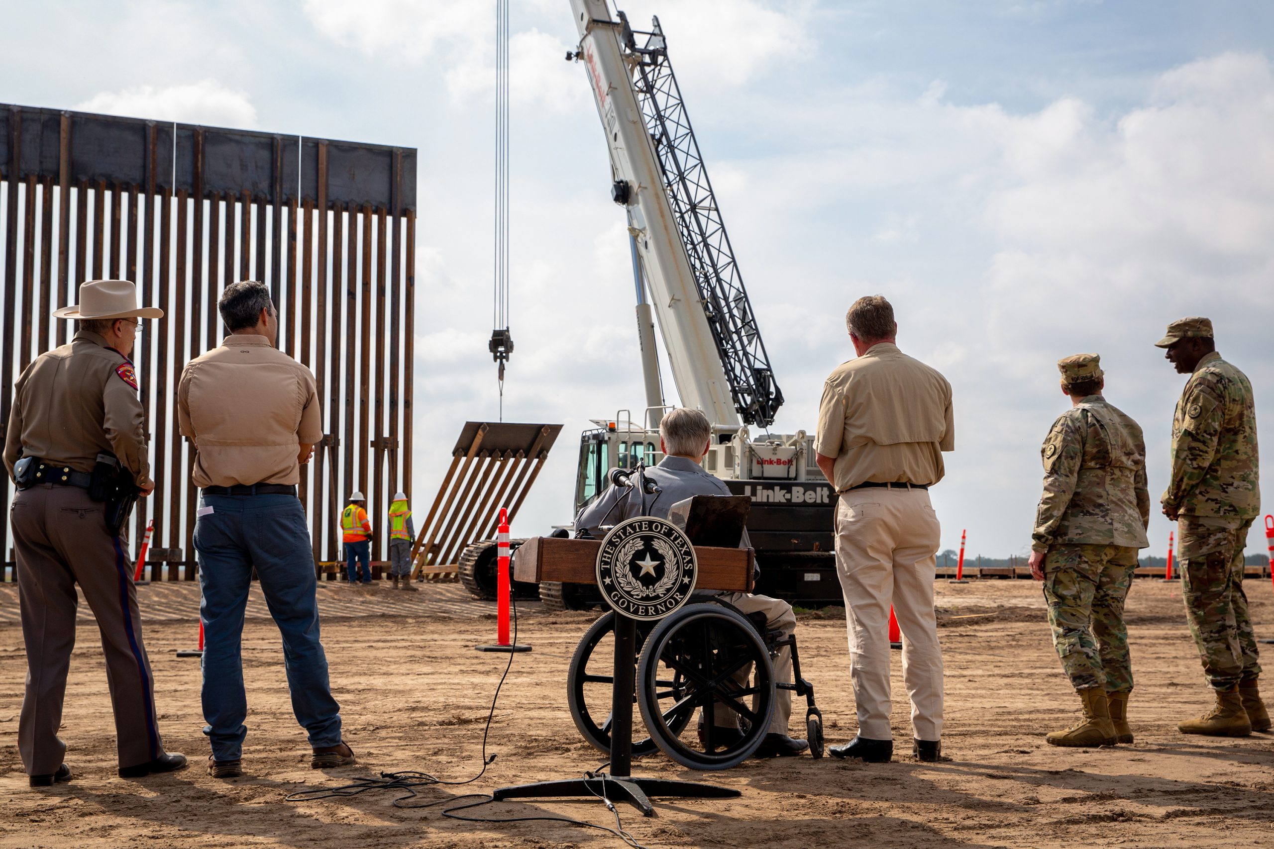First: Gov. Greg Abbott watched a crane lifting a section of the border wall into place in December in Rio Grande City. Last: The state erected border fencing on private property in Del Rio last summer. Credit: Jason Garza and Miguel Gutierrez Jr. for The Texas Tribune