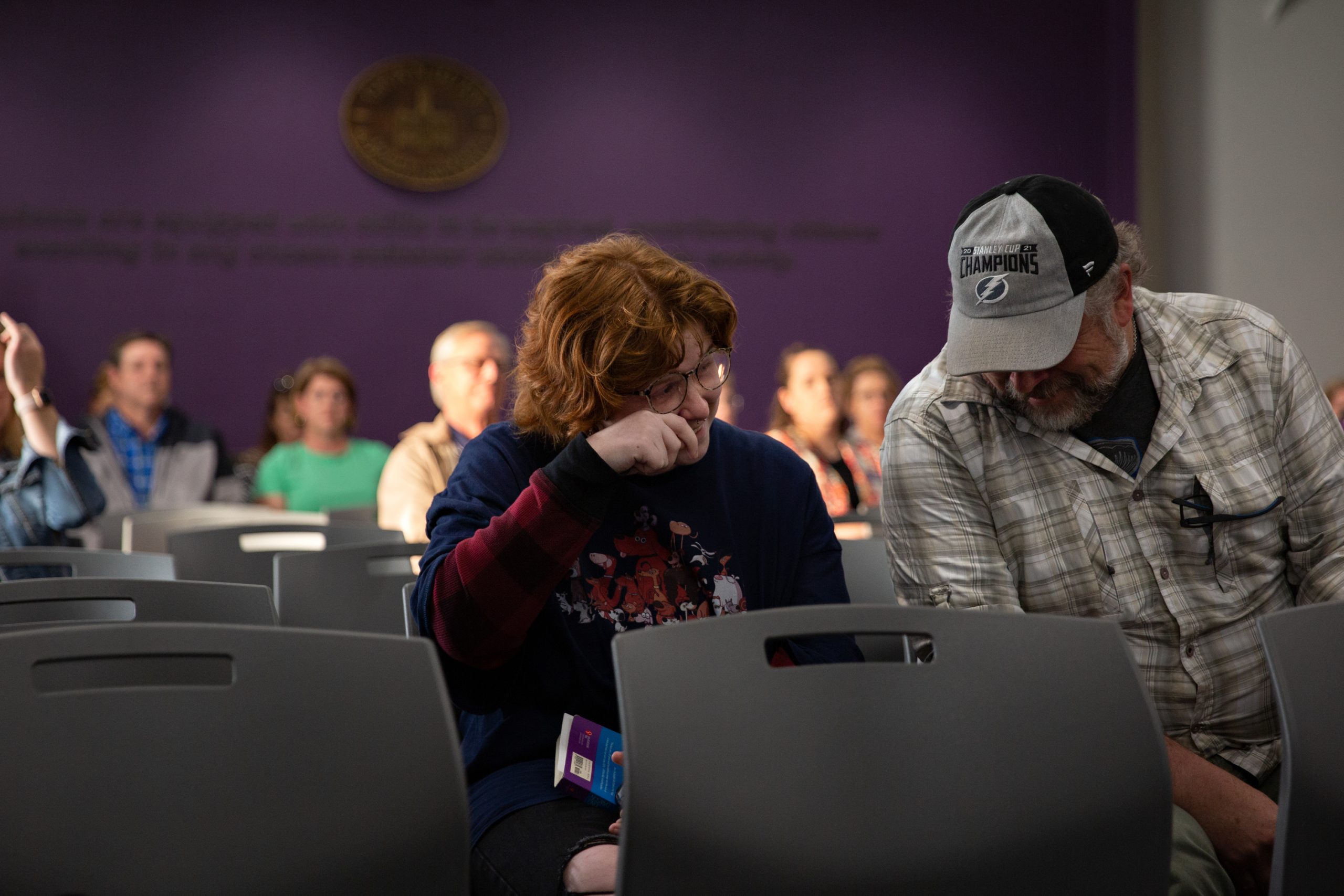 Left: Whiting speaks against the removal of books from school libraries at a Granbury ISD school board meeting. Right: After speaking at the March 21 school board meeting, Whiting rejoined their father, David Whiting, in the audience. Credit: Shelby Tauber for ProPublica/The Texas Tribune/NBC News