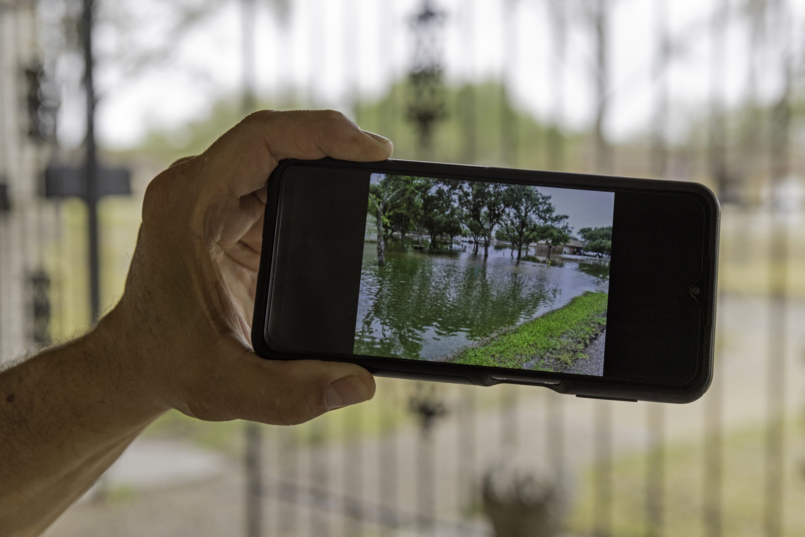 First: For the first time since moving here 30 years ago, Nueces County resident Dan Zamora’s home flooded twice last year. Last: Zamora shows a picture of last year’s flood at his house. Residents are concerned about increased flooding due to residential developments replacing the grassy fields that previously retained stormwater. Credit: Michael Gonzalez for The Texas Tribune