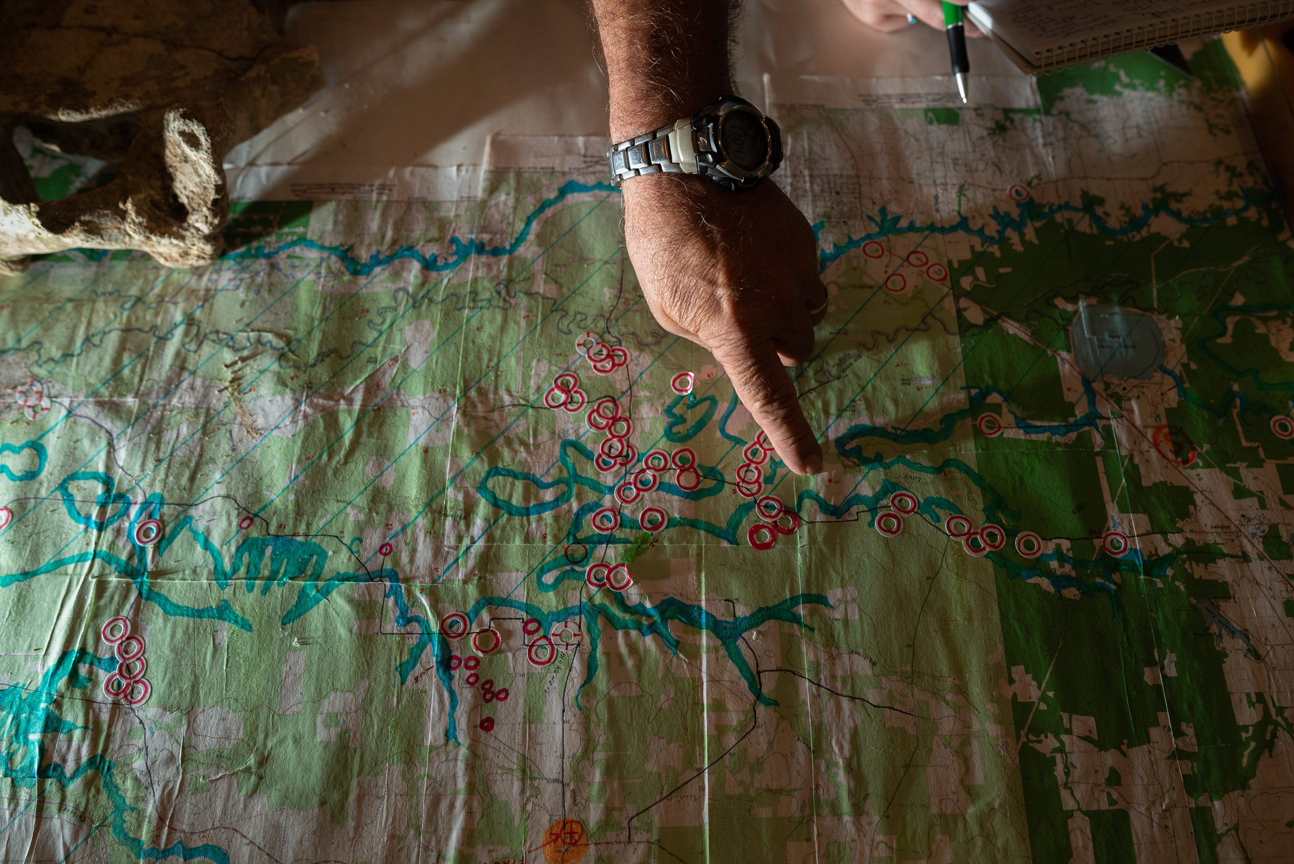 Gary Cheatwood, 83, began by spreading out a large topographical map of Red River County overlaid with the footprint of the planned reservoir, which would cover a swath of the county with as much as 1.5 million acre-feet of water within the next three decades. He’d marked their best guess for the outline of the reservoir with a blue highlighter. Inside the blue lines, he’d drawn red circles to represent occupied homes. Almost 100 red circles fill the map.