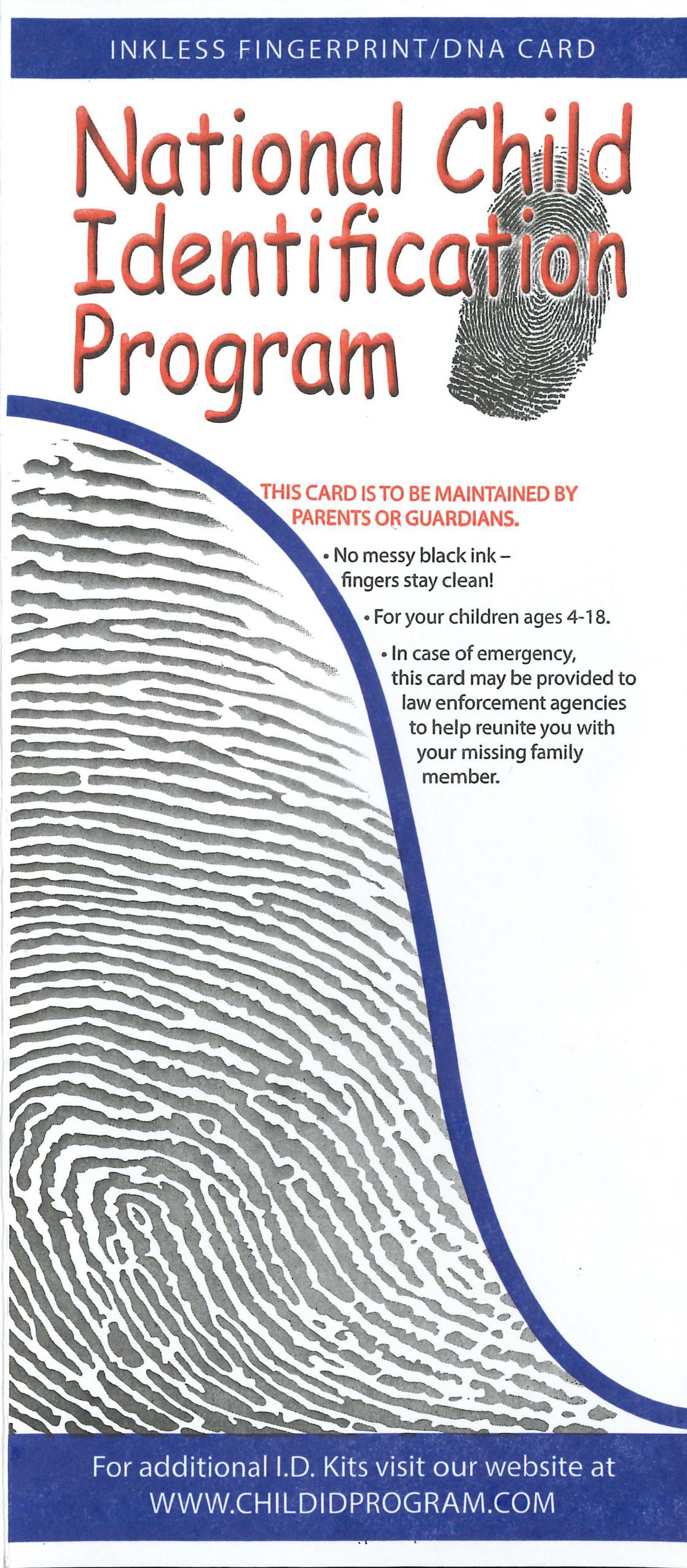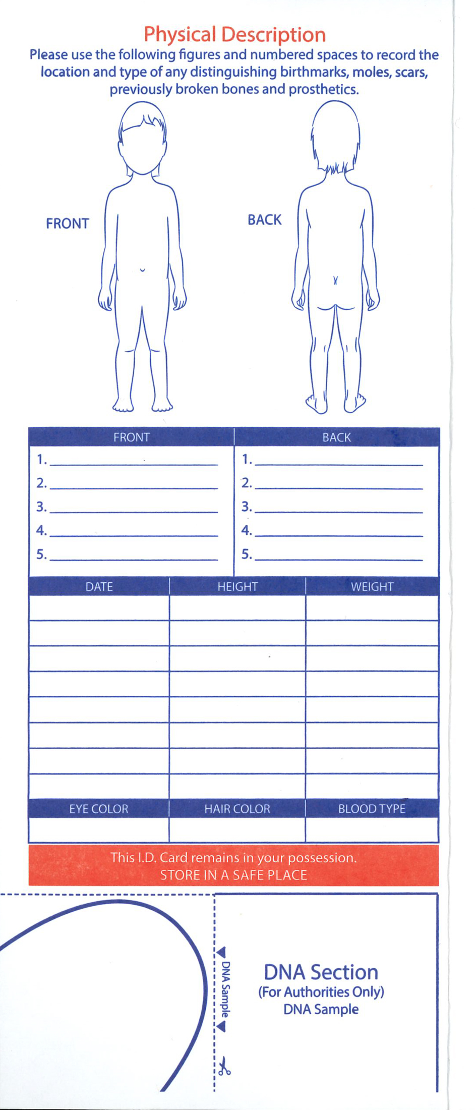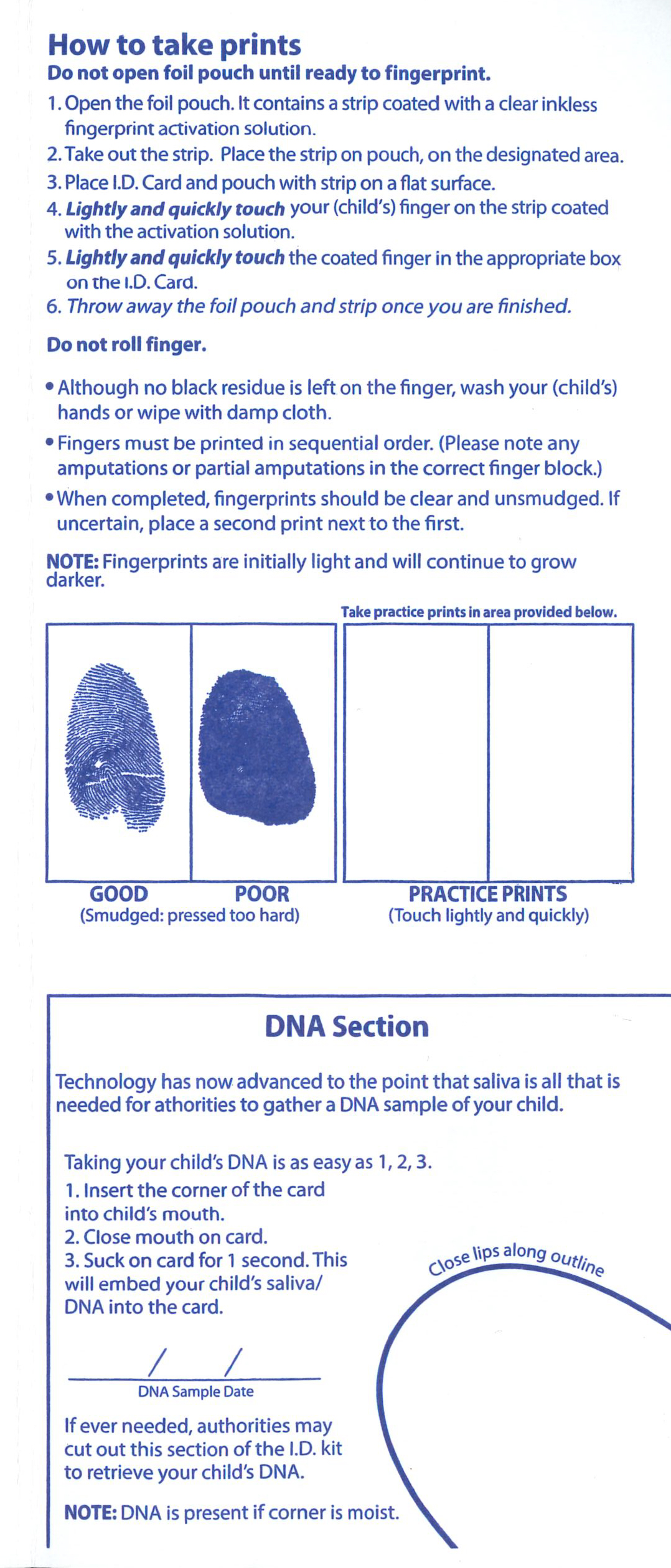 Tucked into each envelope were an inkpad and a piece of paper prompting parents to take their children’s fingerprints, record their physical attributes and get a DNA sample by having them suck on the corner of the form.