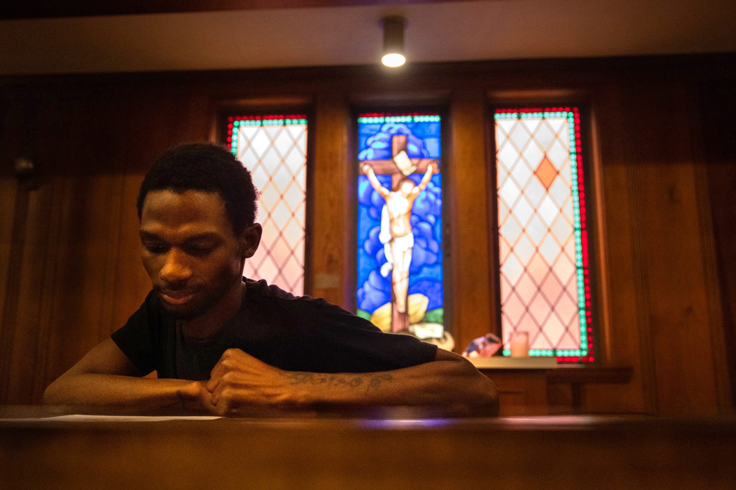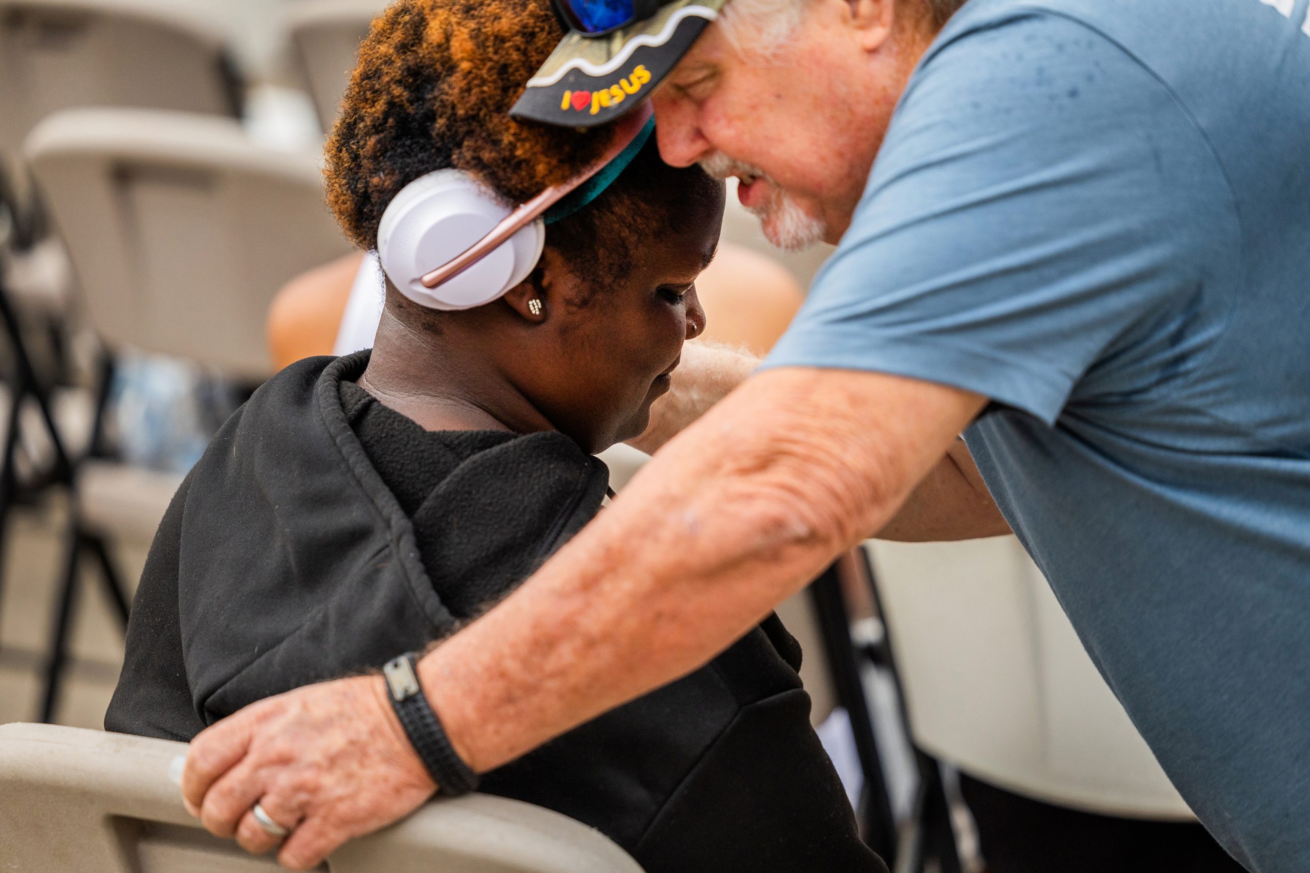 First: Danielle Stephen, 20, has a beverage she received May 8 at Montrose Street Reach. Montrose Street Reach is an organization dedicated to transitioning at-risk people off the streets. Next: Stephen holds a few dollars before offering the cash to Montrose Street Reach. Next: Stephen attends a Montrose Street Reach service, which she calls “street church.” Last: Stephen closes her eyes while Mike MacLaughlin prays for her at a Montrose Street Reach service. Credit: Marie D. De Jesús/Houston Landing
