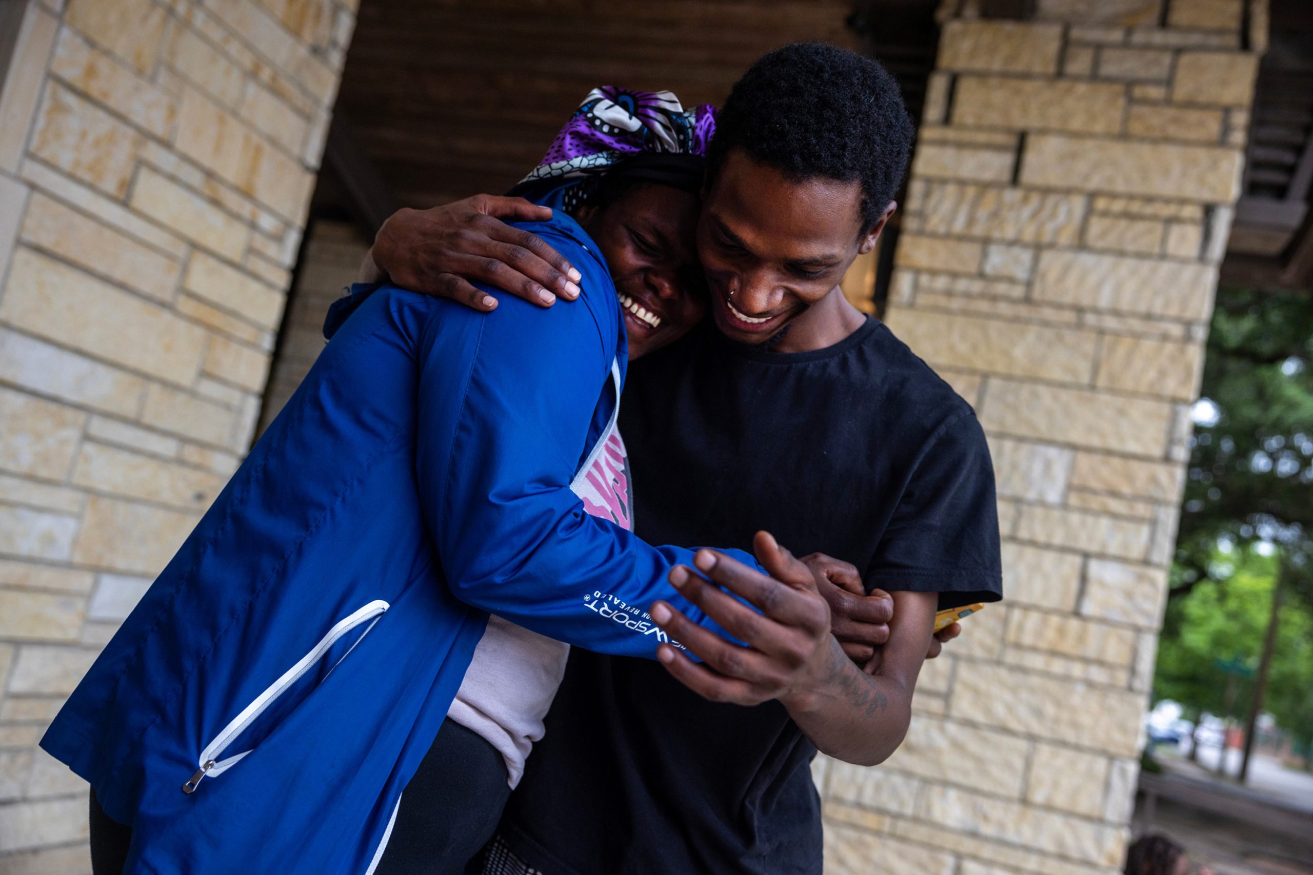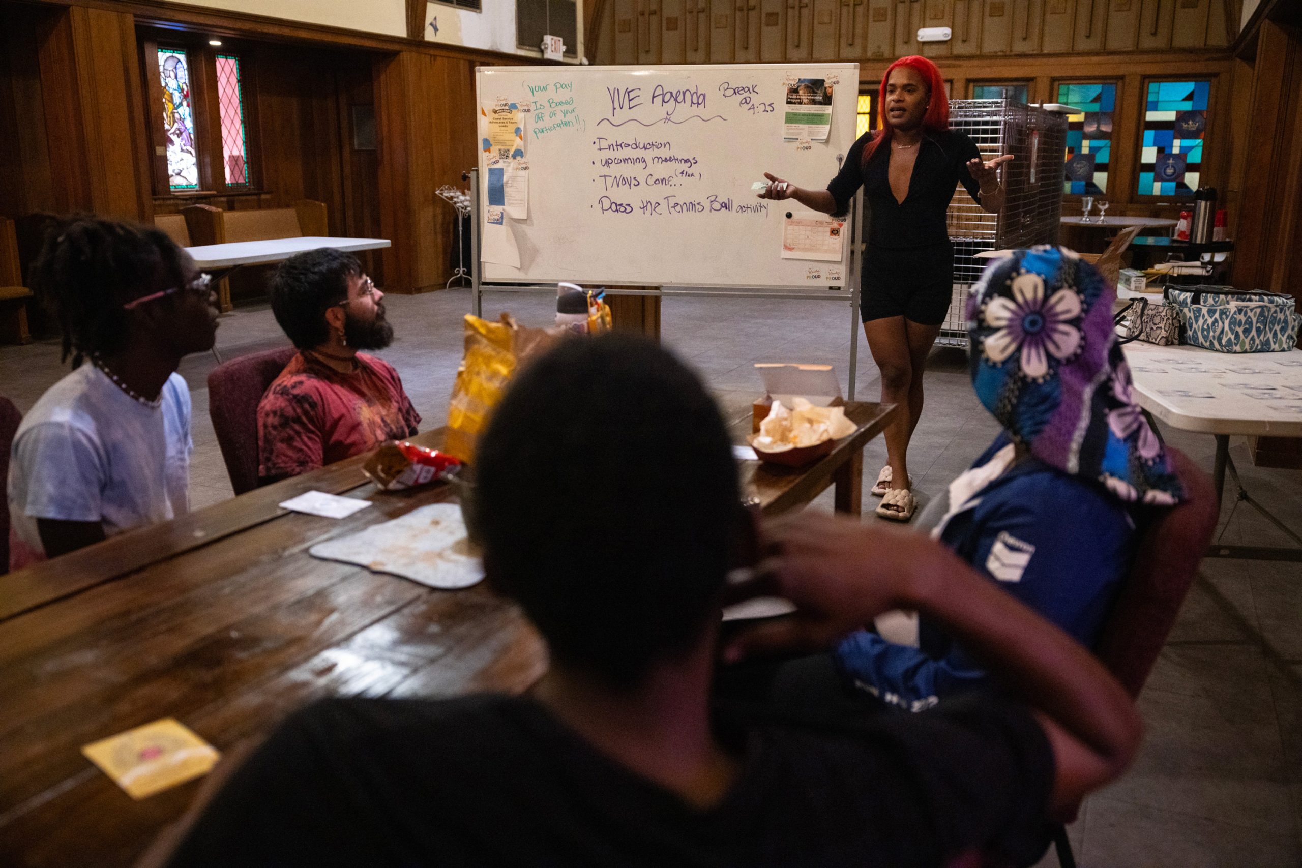 First: Brandon Williams looks at a positive affirmation card during a Youth Voices Empowered event at Montrose Grace Place on May 1 in Houston. Williams was suspended multiple times from Houston ISD’s Yates High School while he was homeless. Next: Williams plays a group game during a Youth Voices Empowered gathering. Next: Kenny Easley leads a discussion during a Youth Voices Empowered event. Next: Alicia Bain, at left, and Williams hug and laugh during a Youth Voices Empowered gathering. Credit: Antranik Tavitian/Houston Landing