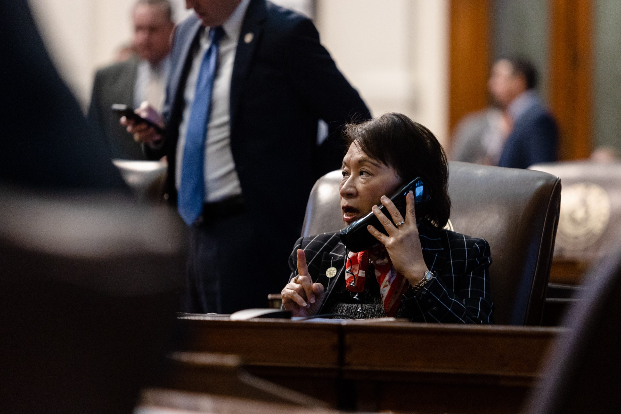First: Then-Miss Texas Averie Bishop poses with students at Young Women’s Leadership Academy of Midland on Jan. 24, 2024. Bishop is the Democratic candidate for state House District 112. Last: State Rep. Angie Chen Button, R-Richardson, speaks on her phone at her desk on the House floor before budget discussions at the state Capitol in Austin on April 6, 2023. Credit: Courtesy of Averie Bishop | Evan L’Roy/The Texas Tribune