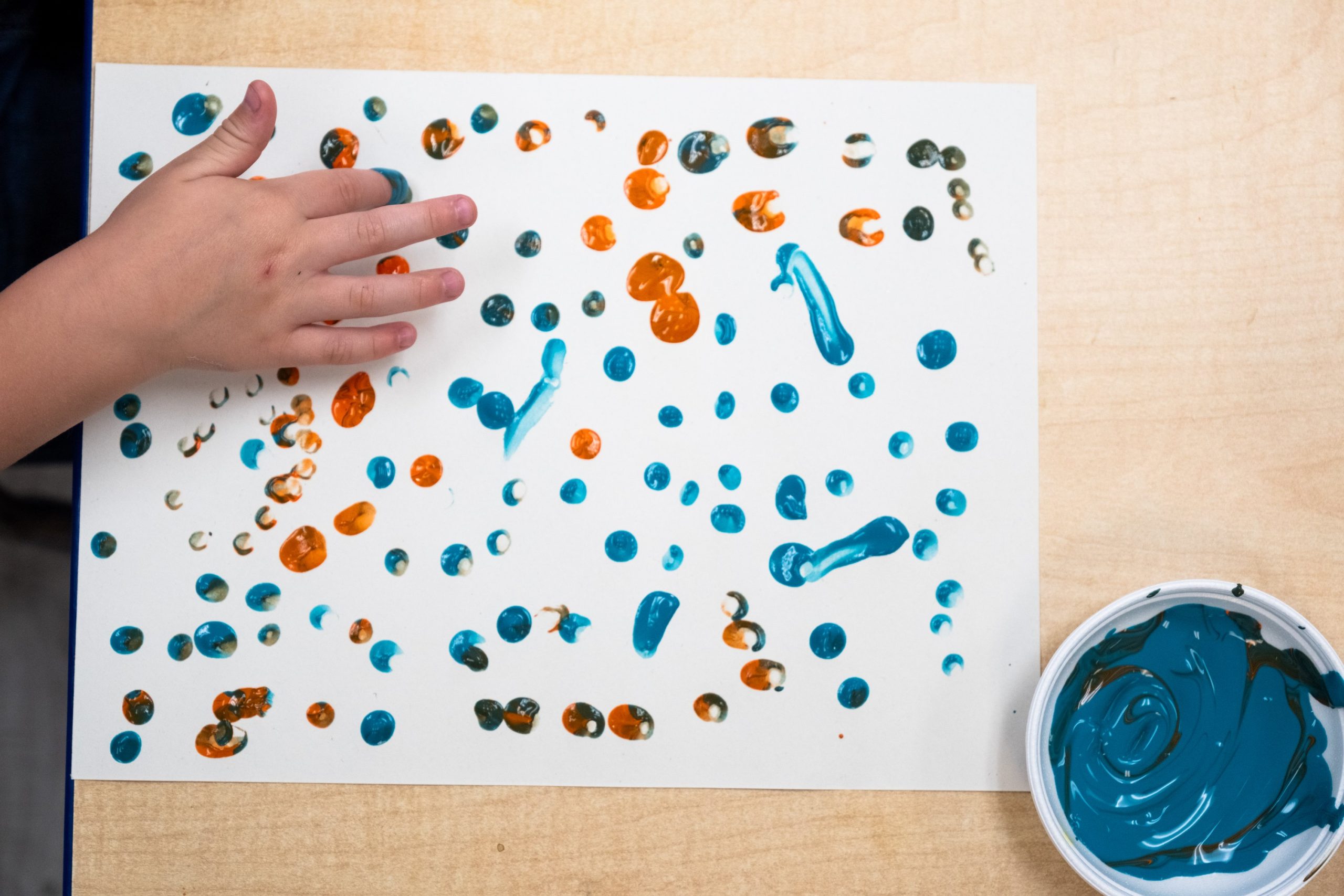 A child, in the first photo, fingerpaints at Katherine Sage Temple Early Learning Center in Diboll. Child care staff, in the second photo, leads an activity. Credit: Michael Cavazos for The Texas Tribune