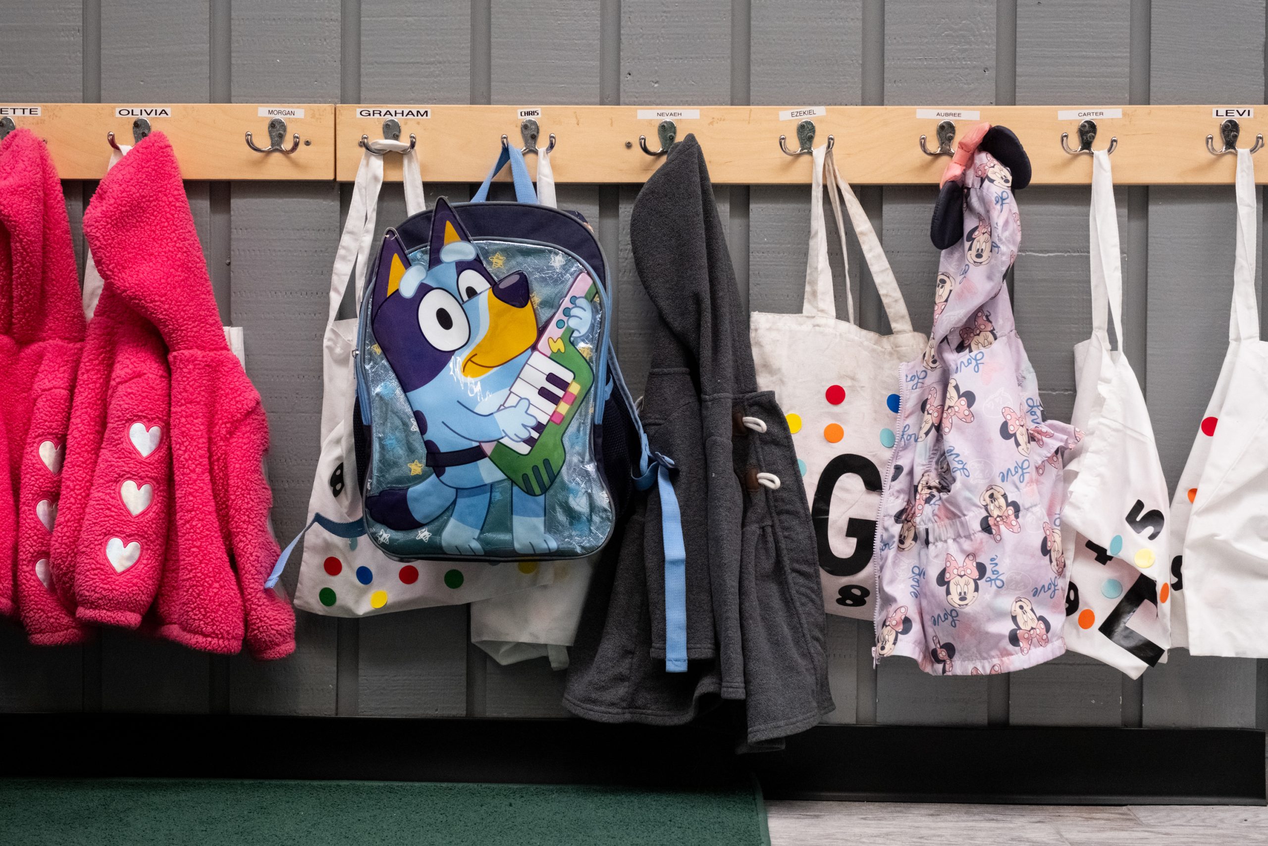 Children’s backpacks line the walls in the first photo at Katherine Sage Temple Early Learning Center in Diboll. Shelbi Adams leads an activity with children in the second photo. Credit: Michael Cavazos for The Texas Tribune